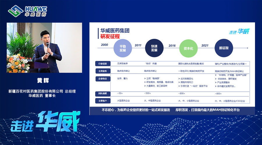 11月8日,華威醫藥聯合前途匯隆重舉行“走進華威,邀您共行”的研討開放日活動,邀請百名醫藥行業翹楚齊聚金陵、共話發展。新疆百花村醫藥集團股份有限公司(股票代碼600721)總經理、南京華威醫藥集團董事長黃輝在大會上全面講述了華威醫藥的轉型發展之路,全方位介紹了華威醫藥集團的研發部署、研發優勢、項目經驗以及管理舉措等。
