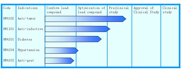 Huawe medical focus on the antitumor, anti infection and treatment of gout, hypertension and diabetes such as a class of new drugs research and development, our development targets, including the international leading novel targets and has been fully validated clinical targets. At present, we have launched a number of new drug development.